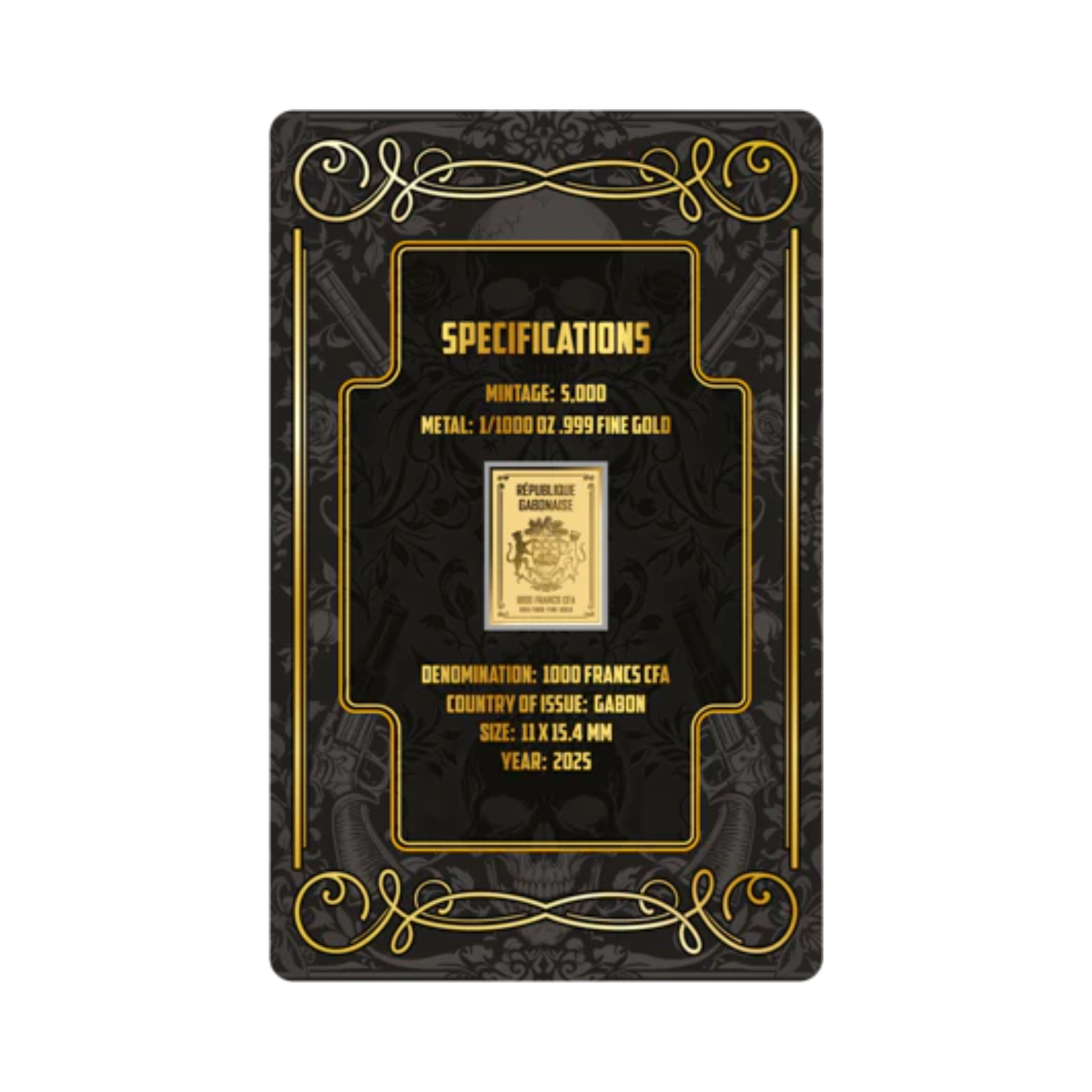 The obverse features the skeletal King of Spades in a tailored suit and golden crown, clenching a cigar as crossed revolvers symbolize his ruthless command. The reverse bears the official coat of arms of the République Gabonaise, confirming its legal tender status with inscriptions for denomination, weight, and purity. Every detail is sharply struck, reflecting a refined sovereign-style finish worthy of any royal collection.
