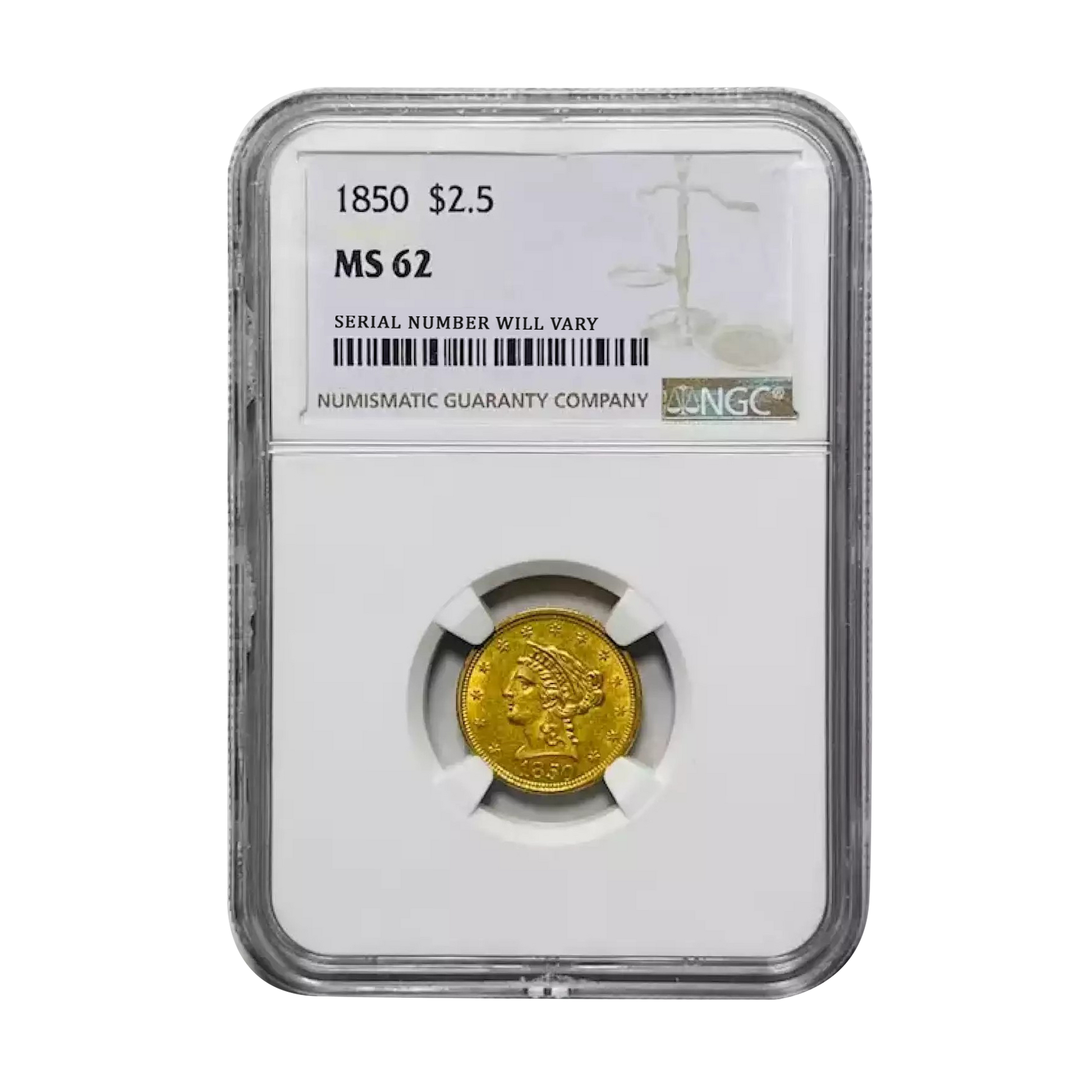 An enduring relic of America’s early gold legacy, the 1850 $2.50 Liberty Head Quarter Eagle – NGC MS62 offers timeless appeal, exceptional rarity, and a tangible link to the nation’s golden past.