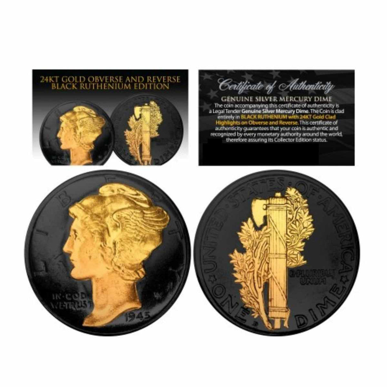 1916-1945 Mercury Silver Dime Black Ruthenium Plated w/ 24KT Gold Clad Highlights