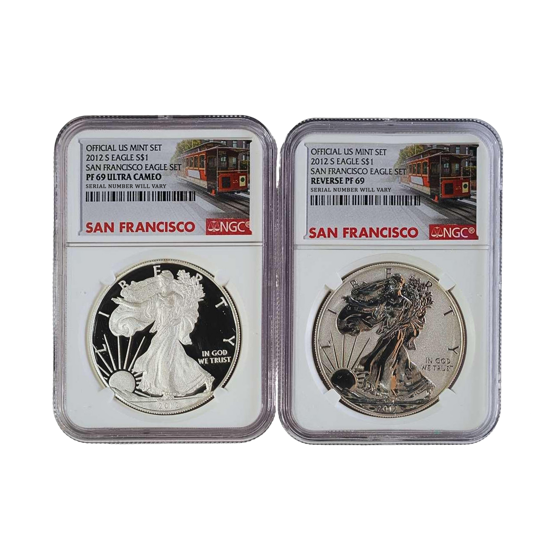 Includes 2 coins: 2012-S Proof Silver Eagle (NGC PF69 UCAM) and 2012-S Reverse Proof Silver Eagle (NGC Rev PF69)