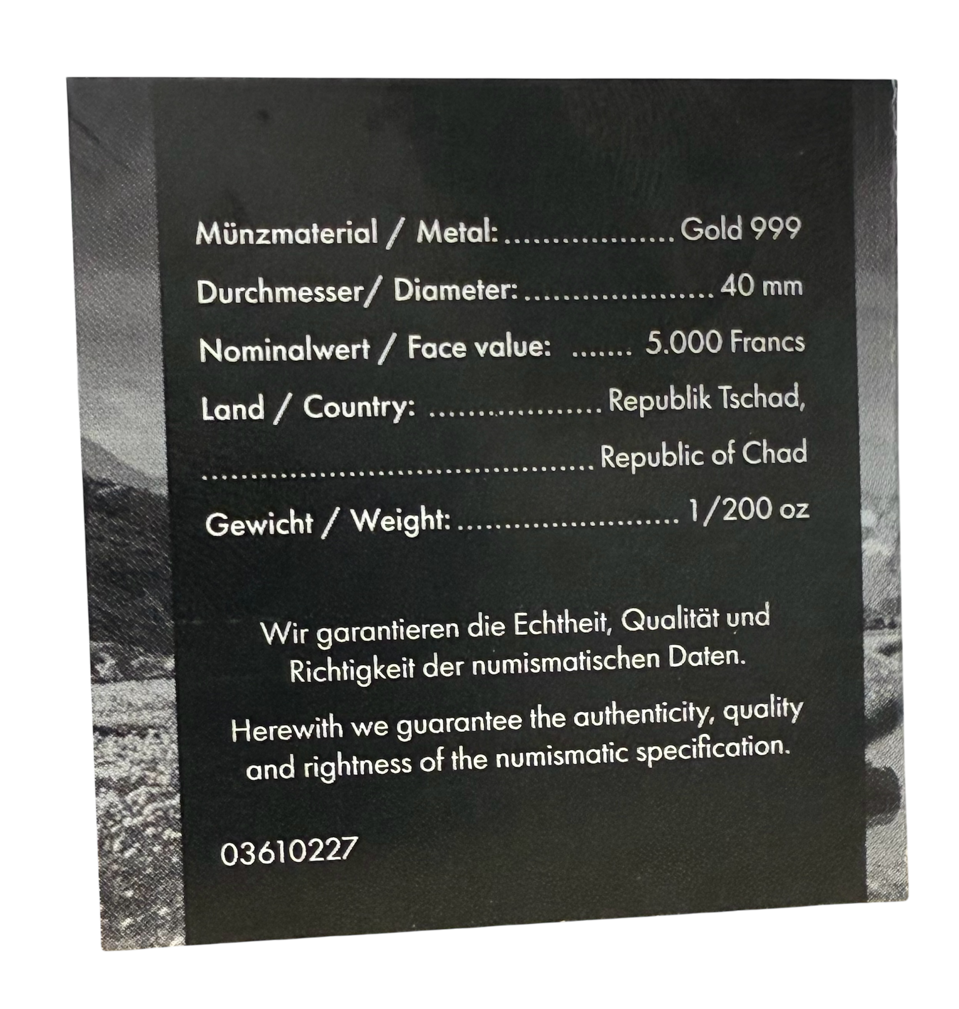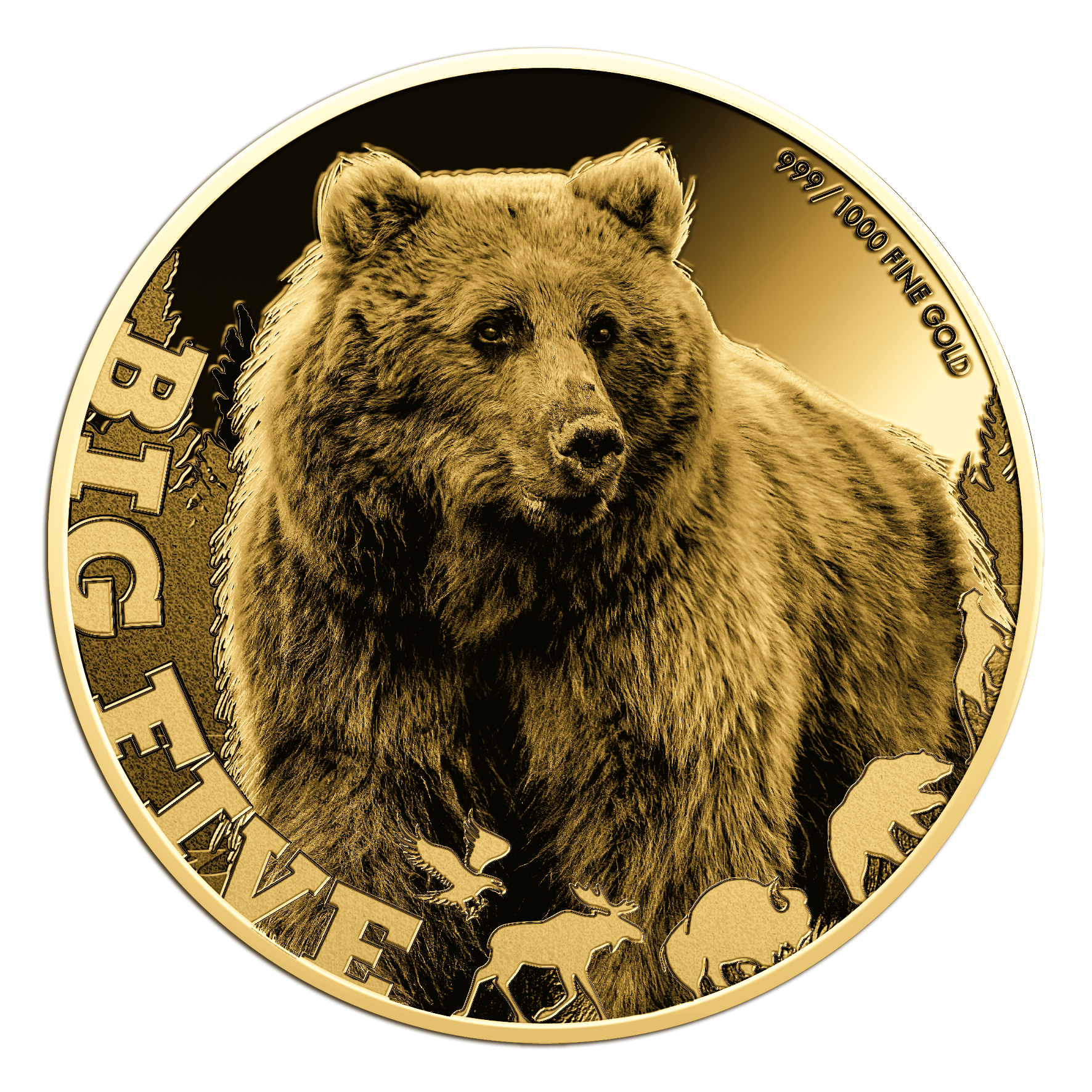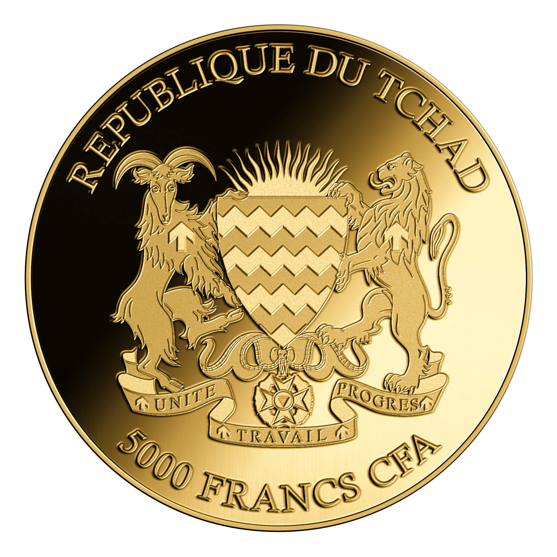 Issued by the Republic of Chad, this coin is part of the popular “Big Five” series, which celebrates some of the most iconic creatures in nature. The grizzly bear, known for its strength and dominance, is beautifully captured on the reverse design. Its presence on this gold coin symbolizes courage and resilience.