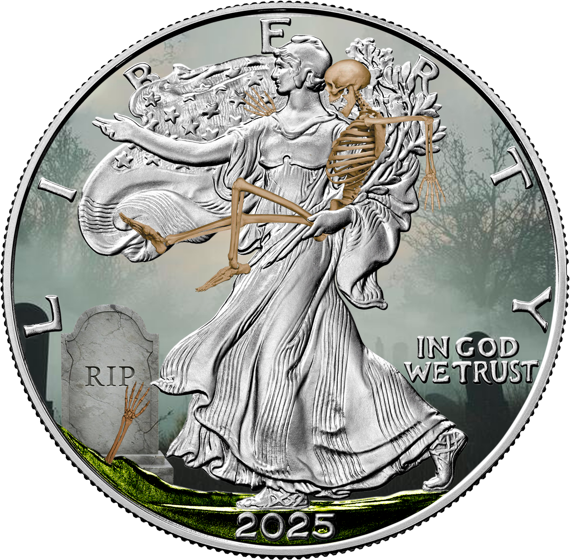 The obverse of the Silver Eagle depicts Lady Liberty crossing a fog-filled cemetery, cradling a golden skeleton in a ghostly waltz between life and death. A tombstone marked “R.I.P.” looms behind her as skeletal hands reach upward from the grave, their touch illuminated by the cold shimmer of the moonlight. On the reverse, a golden skeleton rides the American eagle mid-flight, holding a bone aloft in triumphant resurrection—an unforgettable fusion of patriotic strength and Halloween horror.