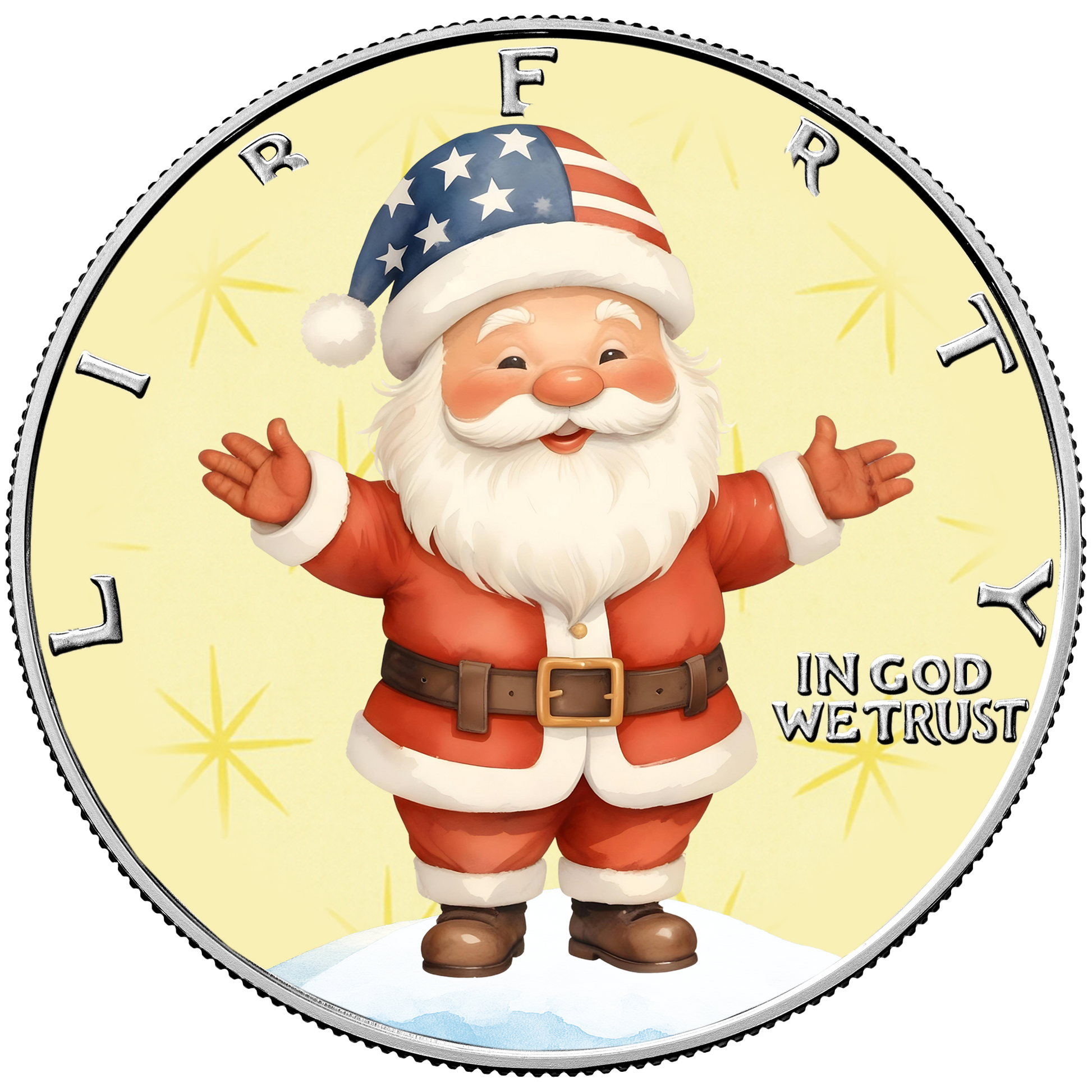 The Santa Claus Edition Silver Eagle Ornament brings warm, classic holiday energy to your collection. The obverse features a jolly Santa in his red suit, complete with an Americana-inspired Santa hat. His cheerfuly open-armed pose radiates joy and instantly evokes the magic of Christmas morning.