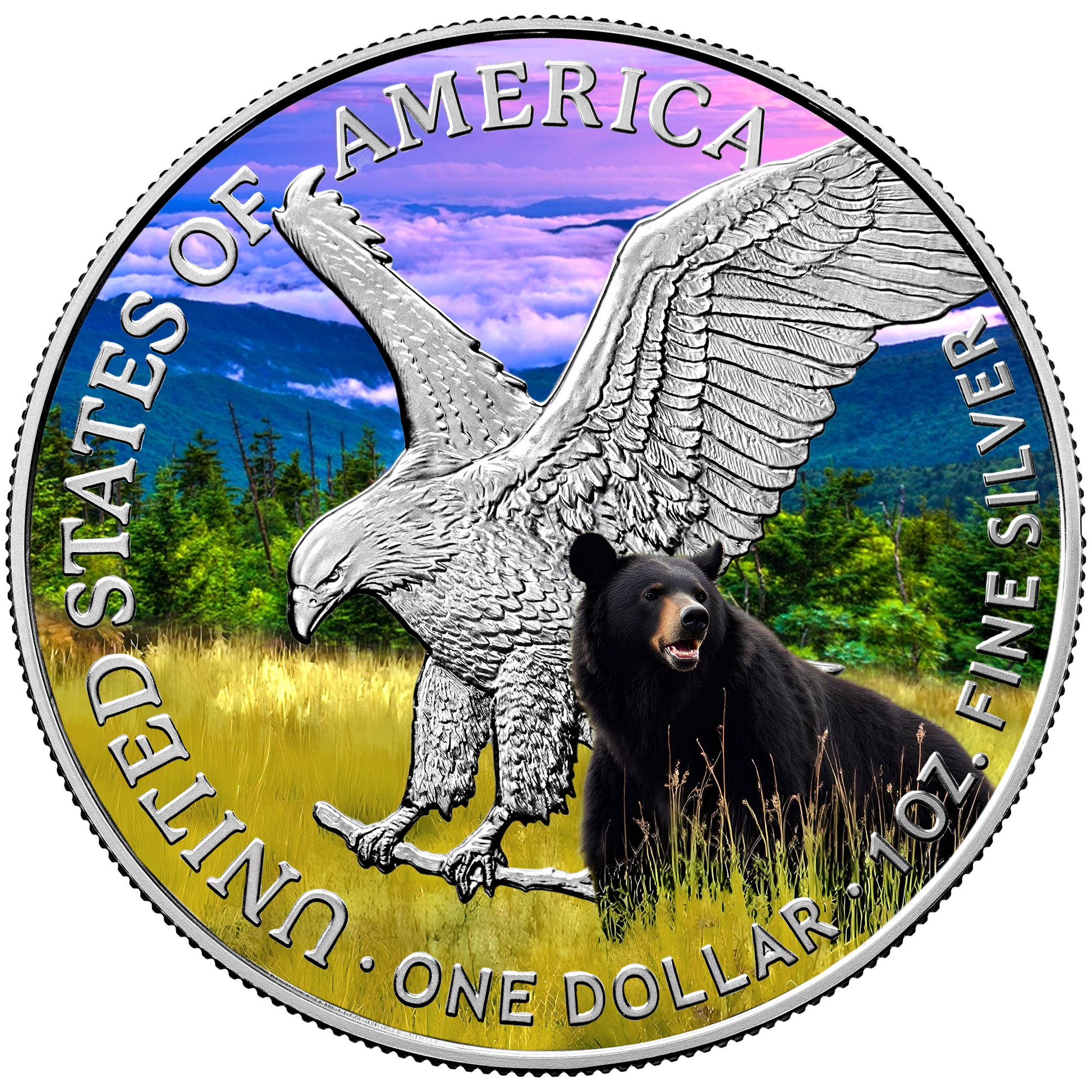 At the heart of this release is a 2025 American Silver Eagle, struck in 1 troy ounce of .999 fine silver and artistically enhanced with vivid imagery inspired by the Smokies’ timeless landscape. The obverse features Lady Liberty illuminated by a glowing Smoky Mountain sunrise, overlooking layers of forested peaks painted in soft amber and green hues. On the reverse, the American Eagle lands gracefully amid golden grasslands beside a powerful black bear — a symbol of strength, harmony, and the untamed spirit of the wilderness.