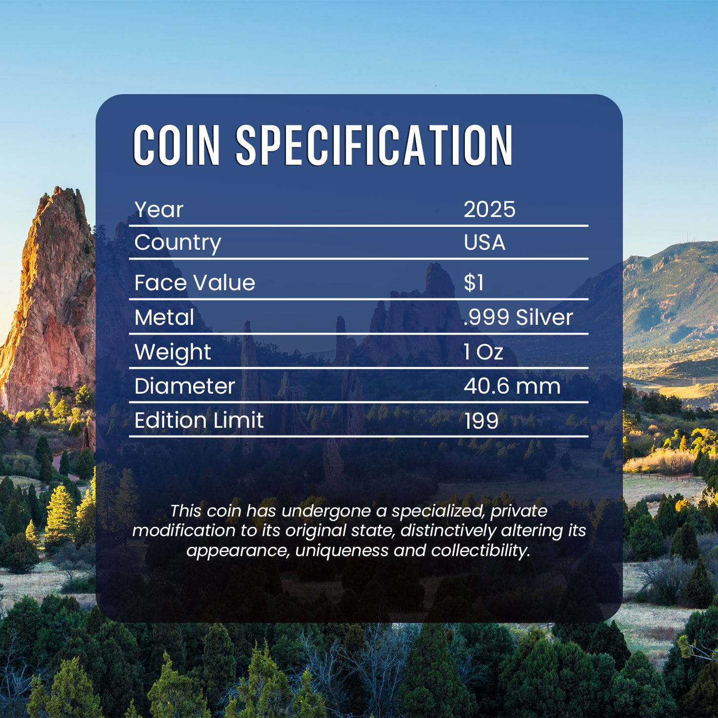 Every coin arrives safely encapsulated in a crystal-clear protective case to preserve its brilliance for years to come. The full-color Certificate of Authenticity features a dramatic sunrise view of Garden of the Gods, complementing the coin’s design with one of Colorado’s most iconic landscapes.