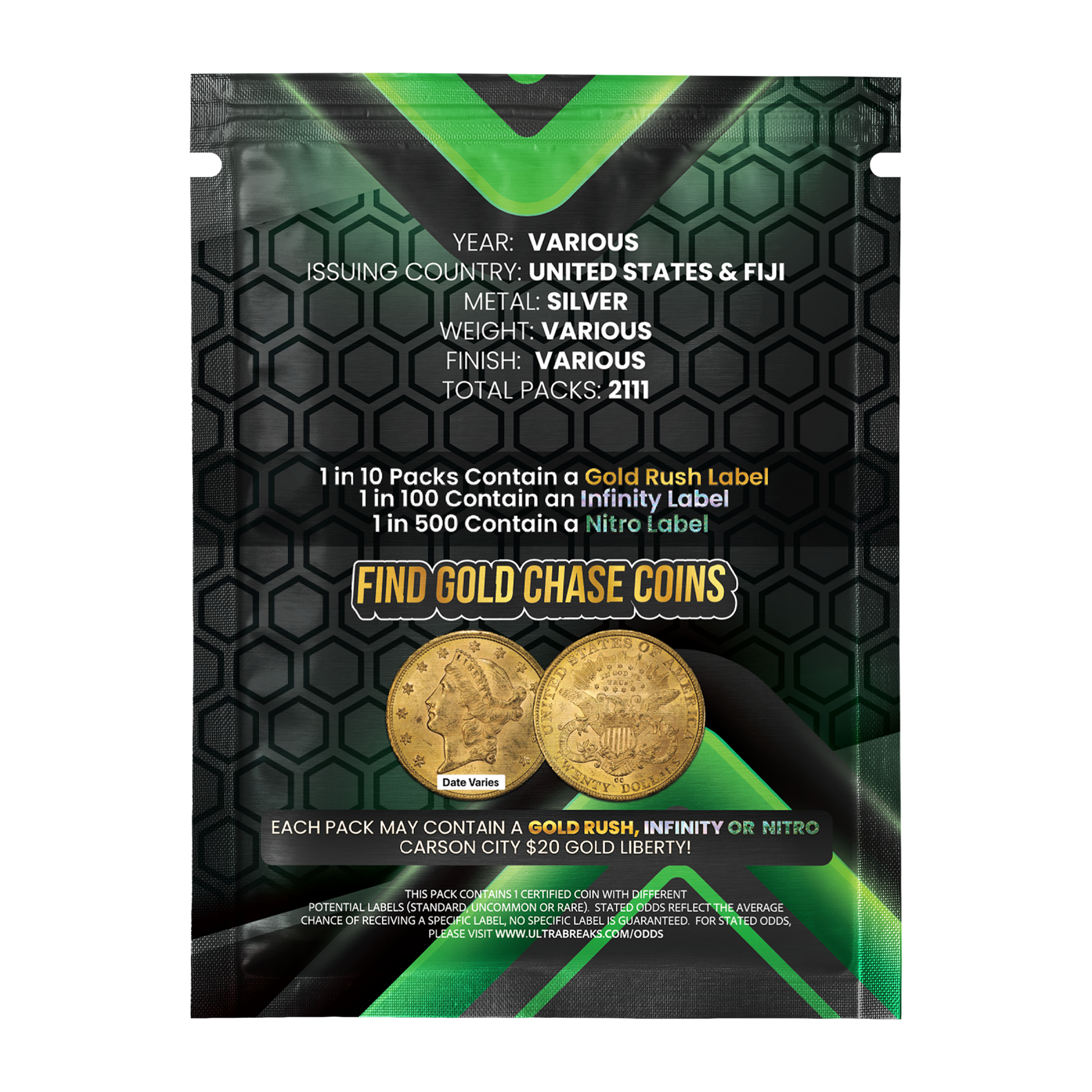 The Carson City Chase is where old-world minting meets modern chase culture — a fusion of flawless modern tributes, authentic Old West silver, and ultra-rare gold legends. Each coin is certified by NGC, featuring our signature Ultra, Gold Rush, and Infinity Labels, plus the debut of the Nitro Label — the rarest label ever created.